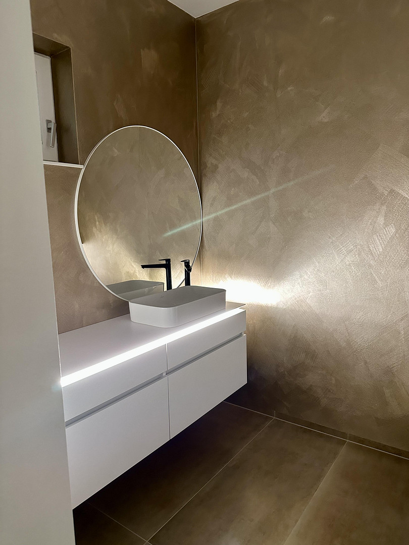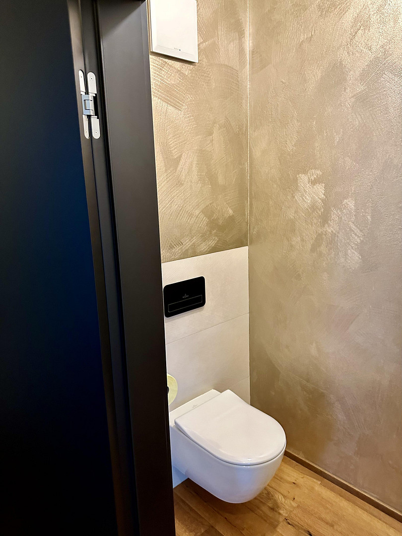 -Bathroom: large walk-in shower with Villeroy and Boch furniture, fine stone tiles.
