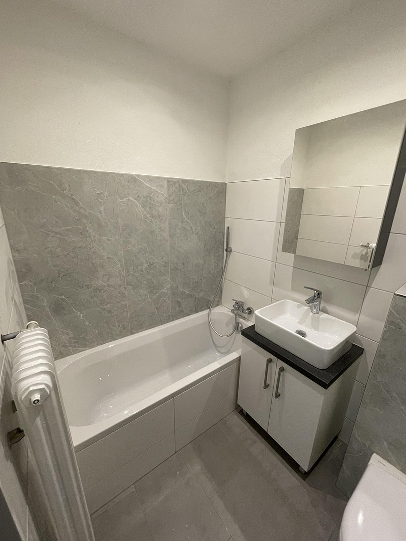 The apartment is divided into an entrance hall, bathroom with WC and bathtub, living room/bedroom and a kitchenette with fully equipped carpenter's kitchen.