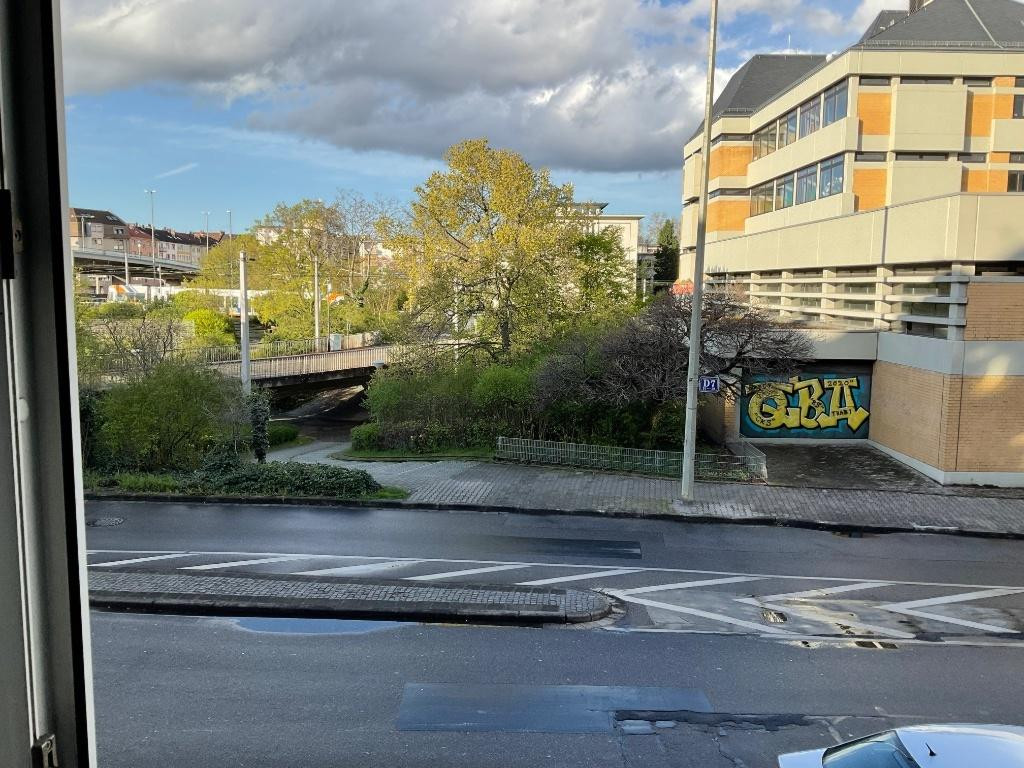 The Rheinstraße streetcar stop is visible from the apartment. There is a large park with benches in front of the apartment. There is also a basketball court.