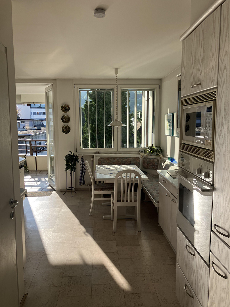 Das Highlight der Wohnung ist der durchgehende Alpenblick nach Osten, ergänzt durch ein sonniges Wohnzimmer nach Süden und kühle Schlafzimmer nach Norden – eine perfekte Kombination aus Helligkeit, Aussicht und Wohnkomfort. Verstärkt wird dieser Komfort durch zwei Balkone (ca. 12 m² und 16 m²) und überdurchschnittliche Raumhöhen.