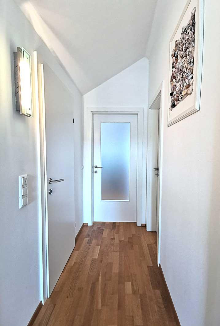 Im Eingangsbereich wurde eine Wand als Abtrennung von Wohnzimmer und Vorraum eingezogen - sie bietet genügend Fläche für einen großen Seitens der Gemeinde gibt es eine Bewilligung zum Bau einer Dachterrasse mit Seeblick im DG.