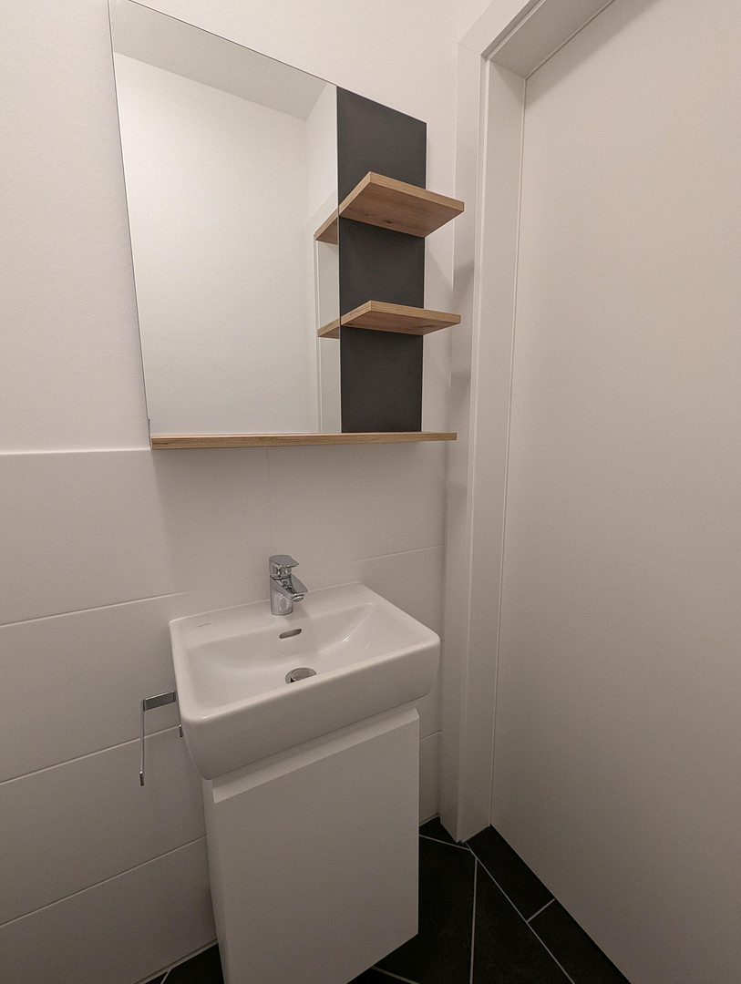 - WC: Waschbeckenunterbau der Marke Laufen, Spiegel mit seitlicher Ablagefläche, Accessoires