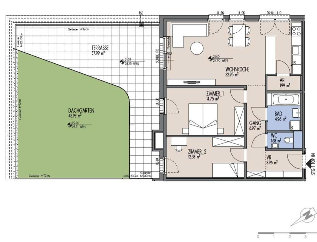 - Dachterrasse: 86.97 m², davon 48.98 m² Grünfläche