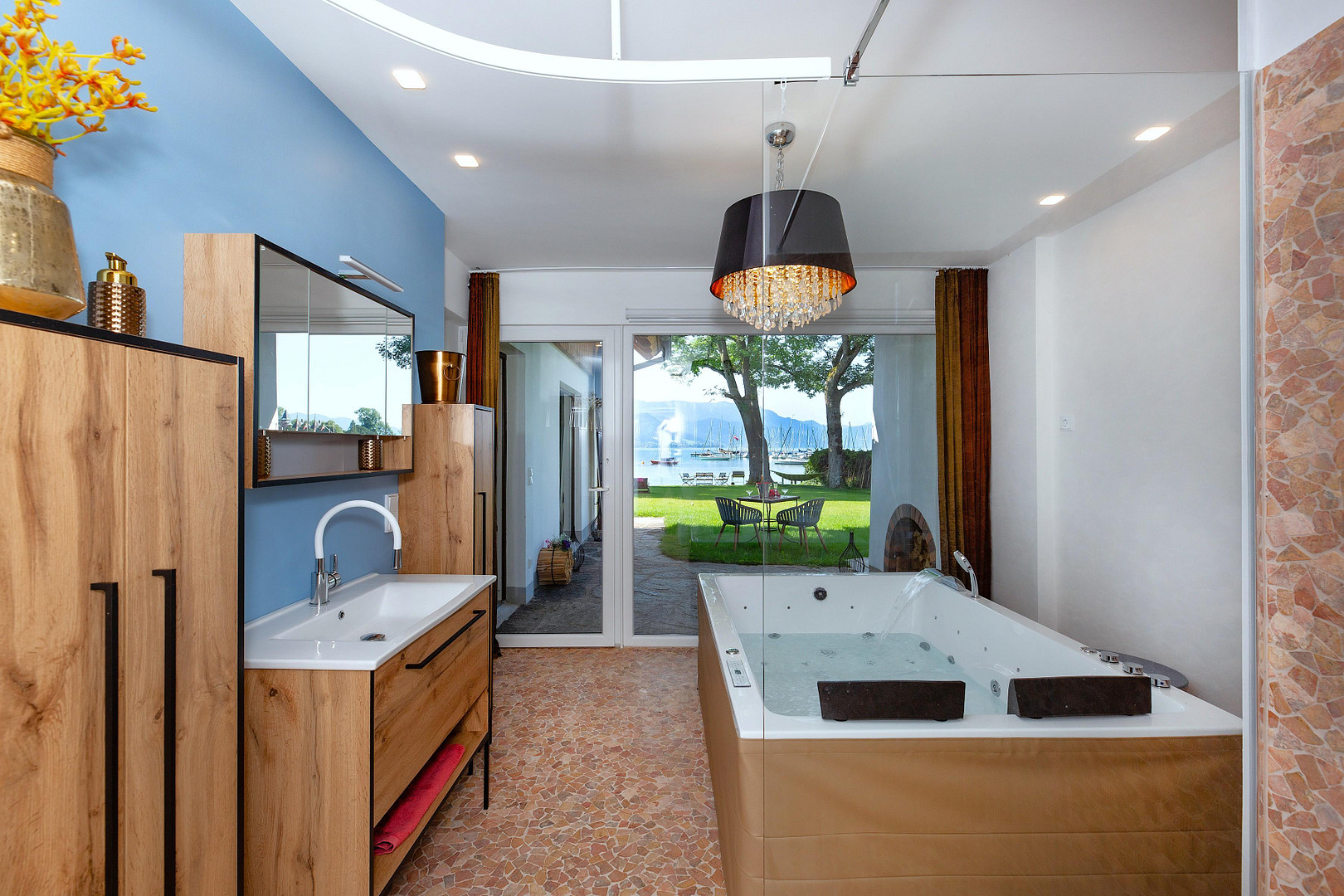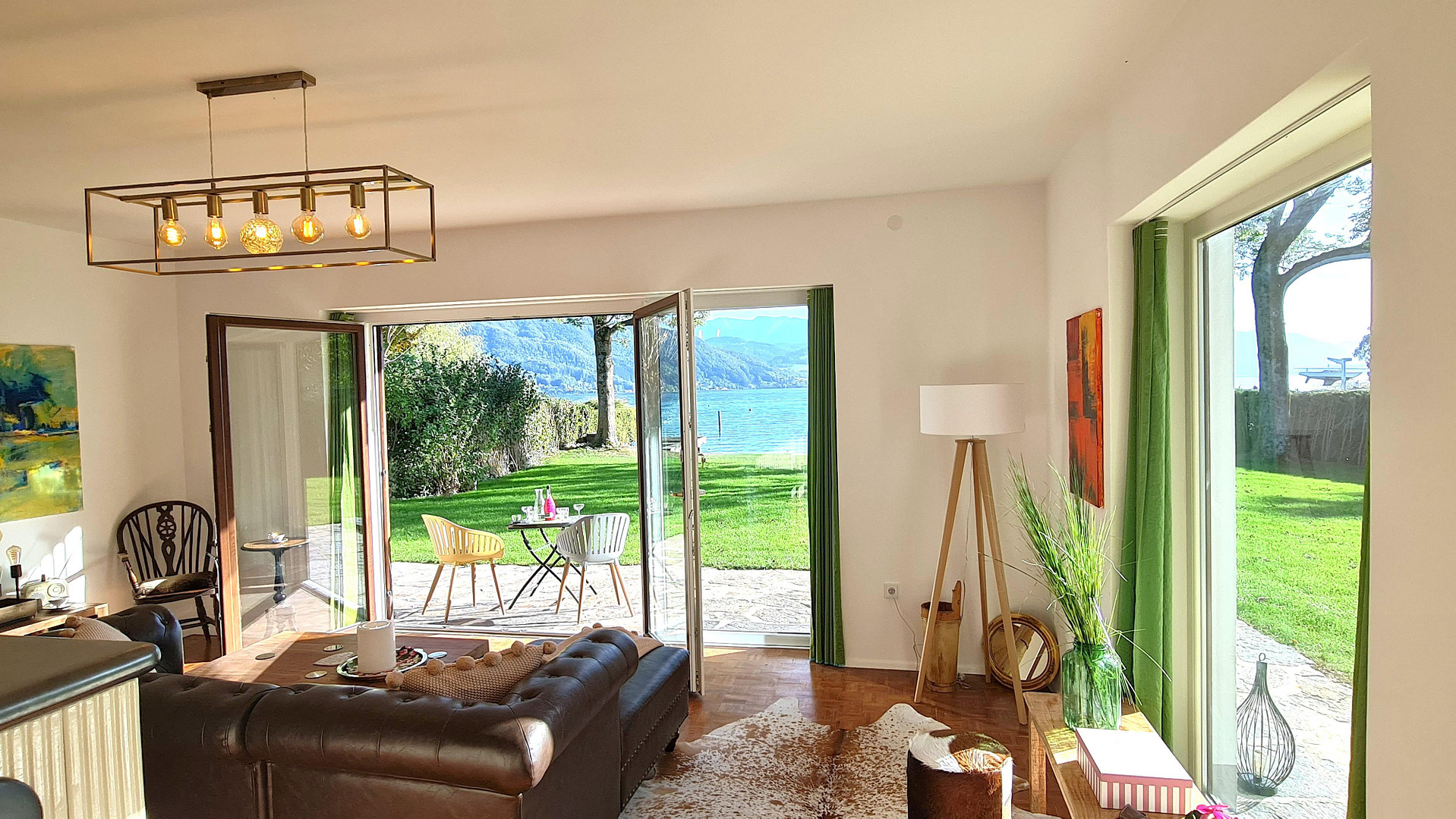 * Lichtdurchflutete Raumaufteilung mit offener Wohnküche und Panoramafenstern zum See