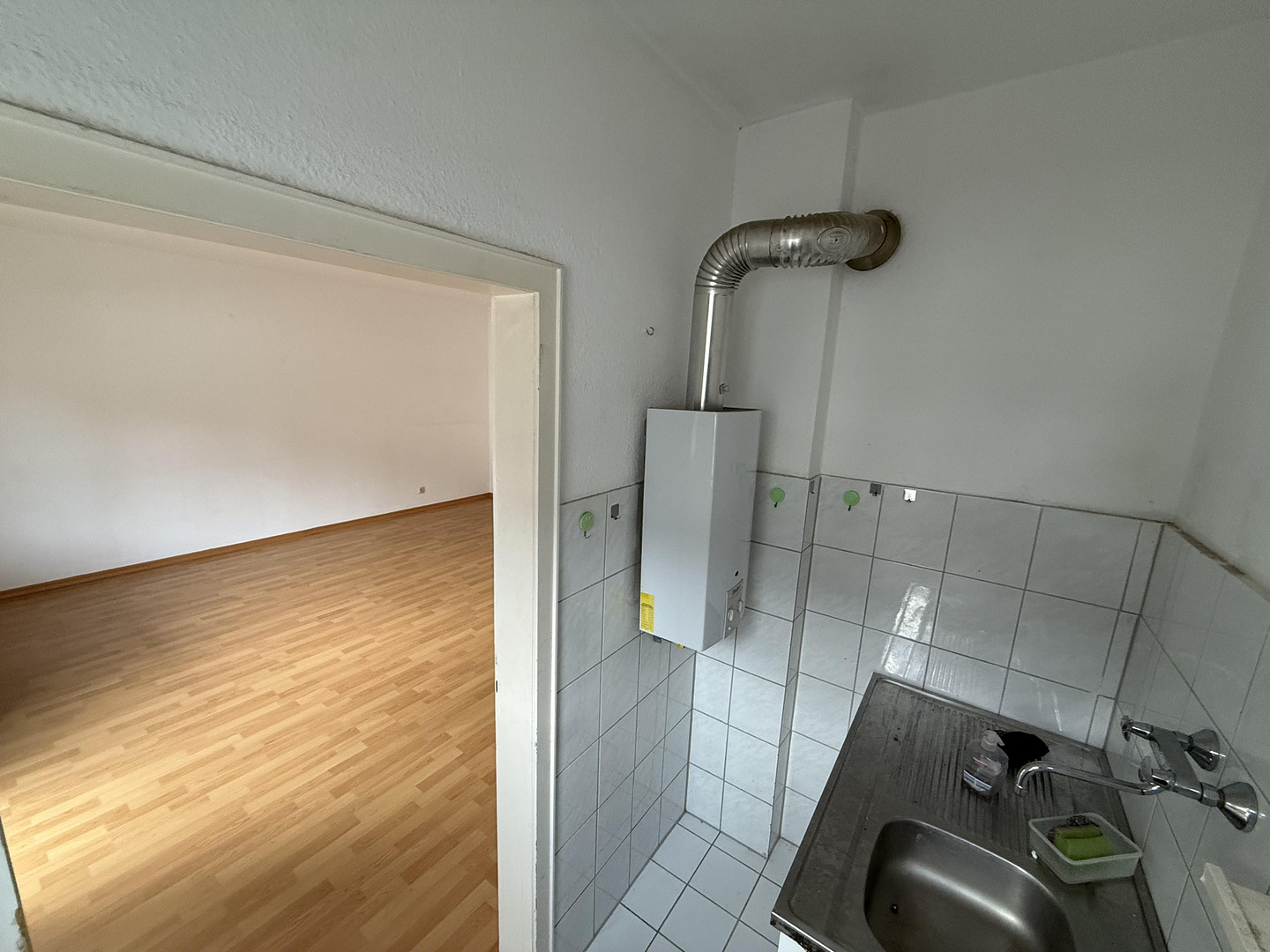 Der Wohn- und Schlafraum ist mit normalem Laminatboden ausgestattet und bietet ausreichend Platz für Wohnen, Schlafen und Arbeiten. Vom Wohnbereich aus gelangen Sie auf den Balkon zur Hofseite, der zum Entspannen einlädt.