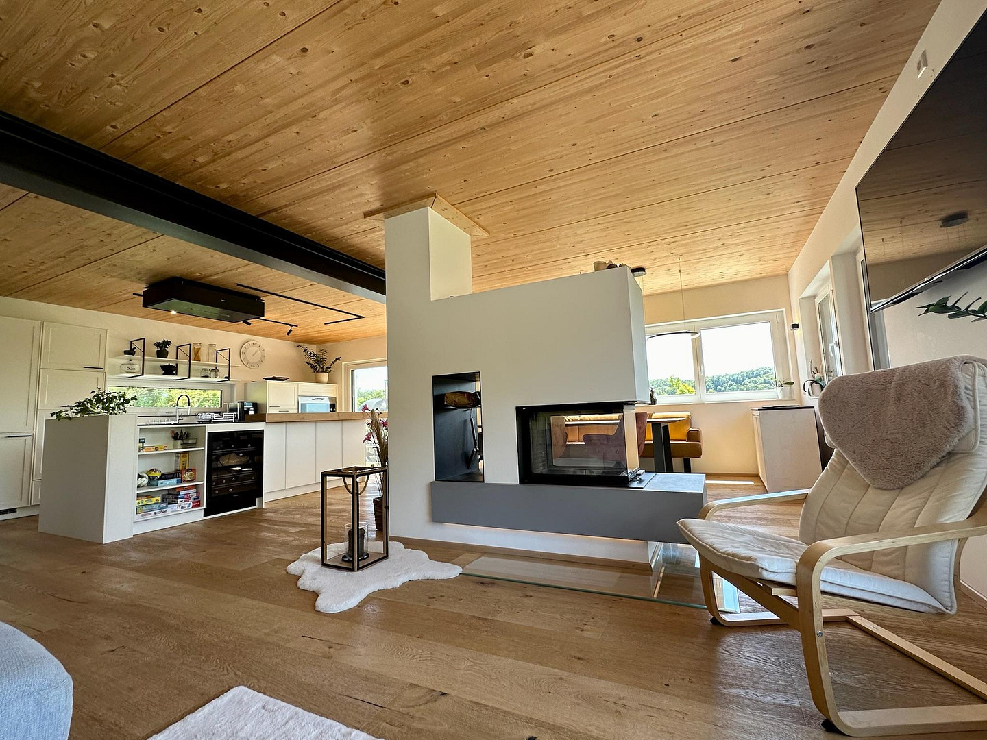 - Offener Wohn- und Essbereich mit dreiseitigem Holzkamin