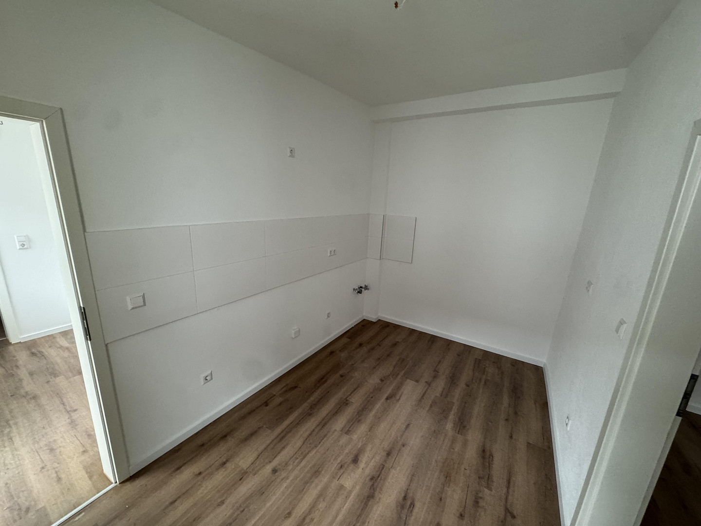 Die Wände sind mit feinem Rauputz in weiß gehalten.
