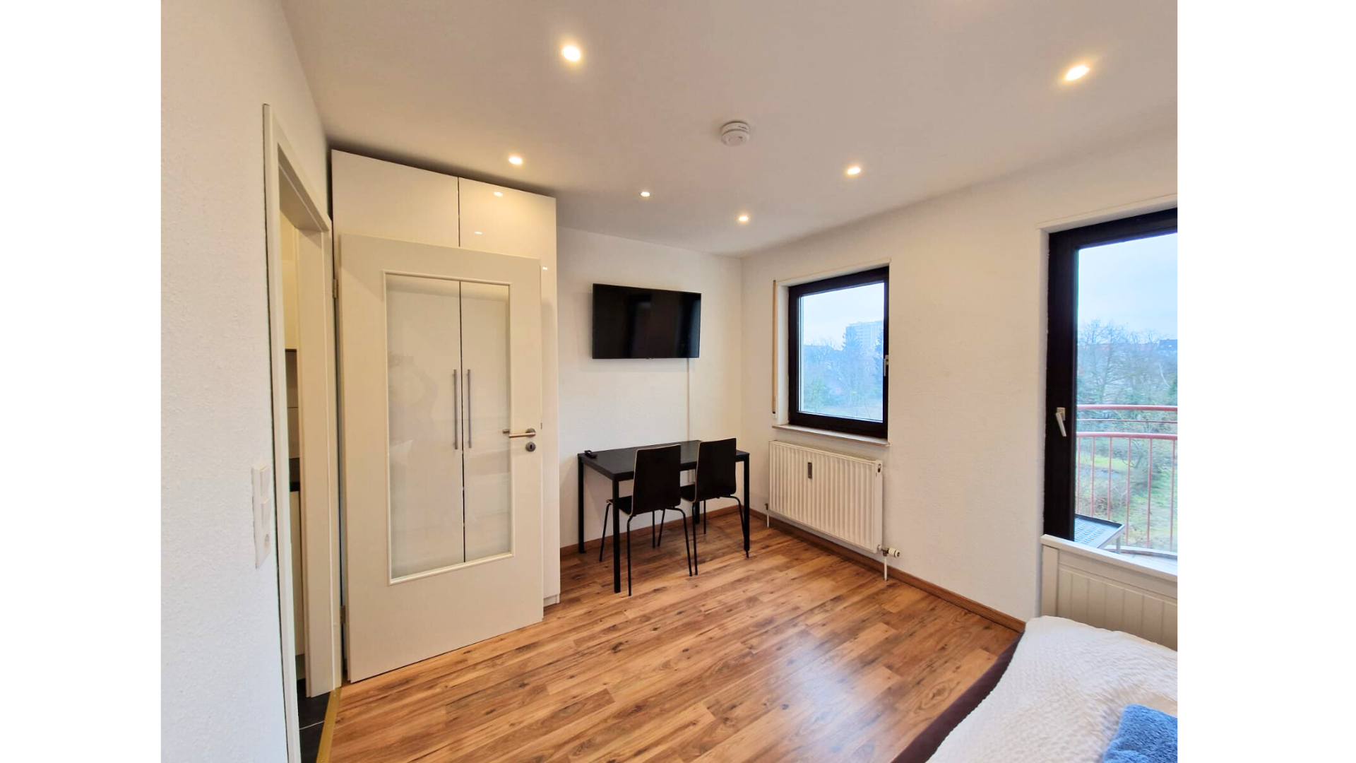 • Wohnen/Schlafen: Komfortables Bett, geräumiger Kleiderschrank, Esstisch, TV-Board und Flatscreen-TV.