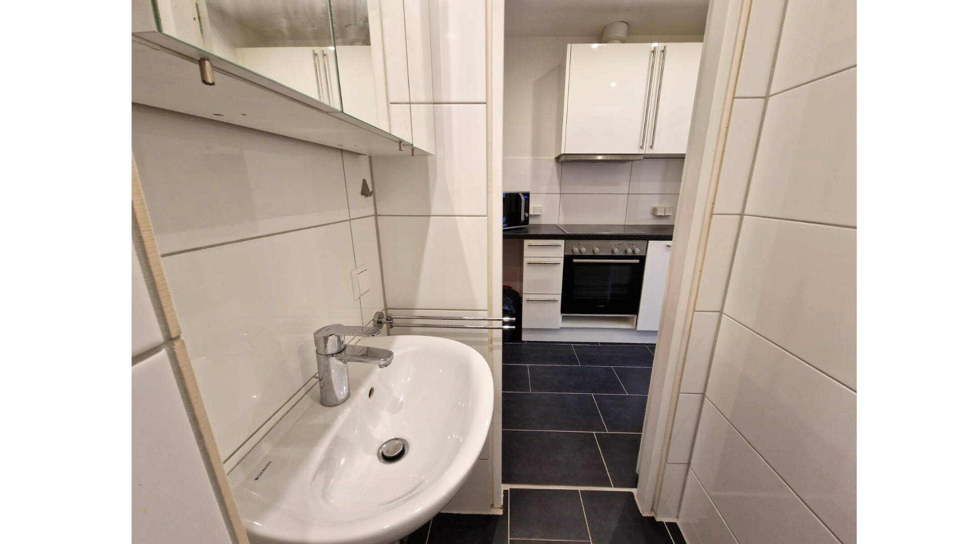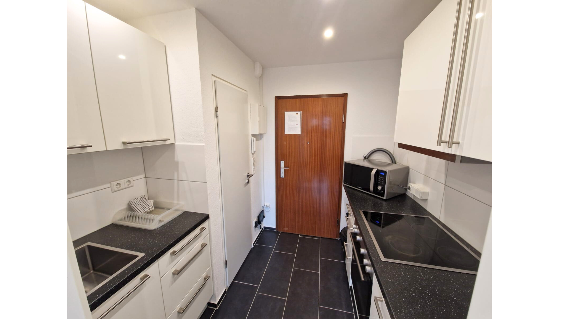 • Küche: Hochwertige Einbauküche (kein billiger Pantry-Block!) mit Ceranfeld, Backofen, Abluft-Dunstabzug, Kühlschrank und Mikrowelle.
