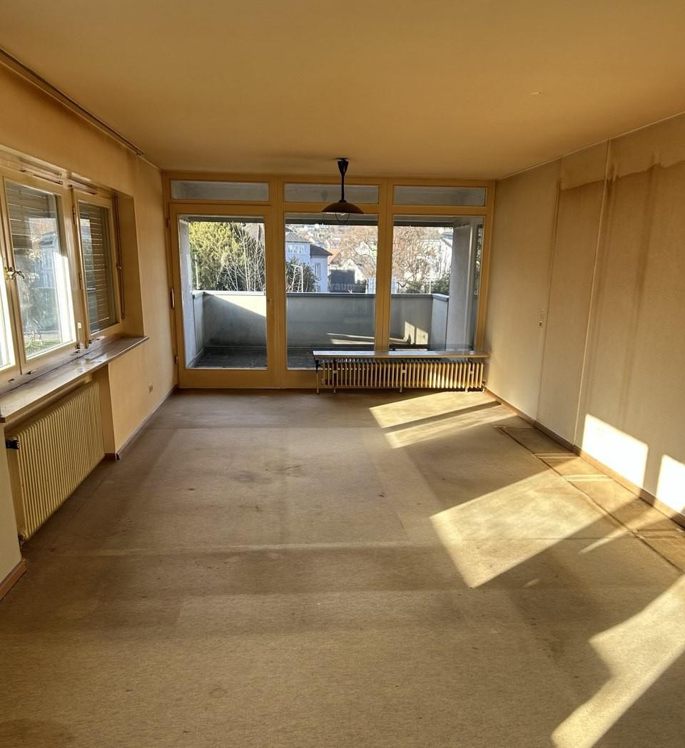 Obergeschoss: ca. 97 m², 3 Zimmer, frei, renovierungsbedürftig, offener Wohn- und Essbereich mit großen Fensterfronten, Balkon mit Weitblick, separate Küche, Tageslichtbad + Gäste-WC, eigenständige Gasetagenheizung (Heizkessel 2022 erneuert).
