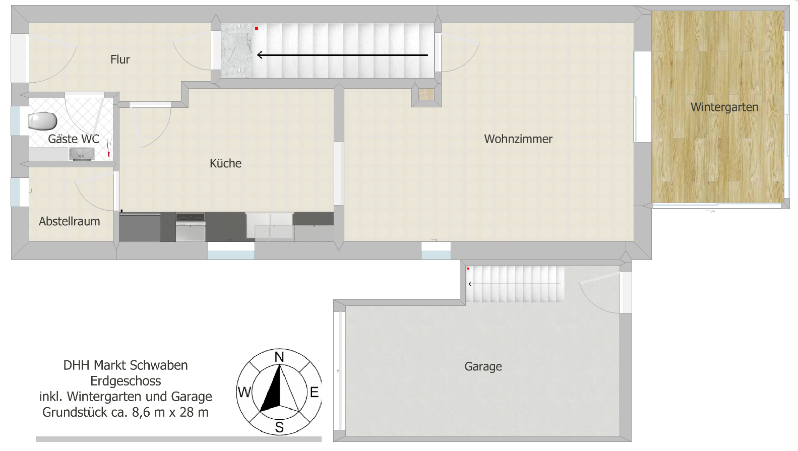 Eingangsbereich mit Garderobe, Gäste-WC, Küche inkl. Einbauküche mit Essbereich und separater Speisekammer, großes Wohnzimmer mit Zugang zum überdachten und verglasten Wintergarten mit Schiebetüren, Südost-Ausrichtung.