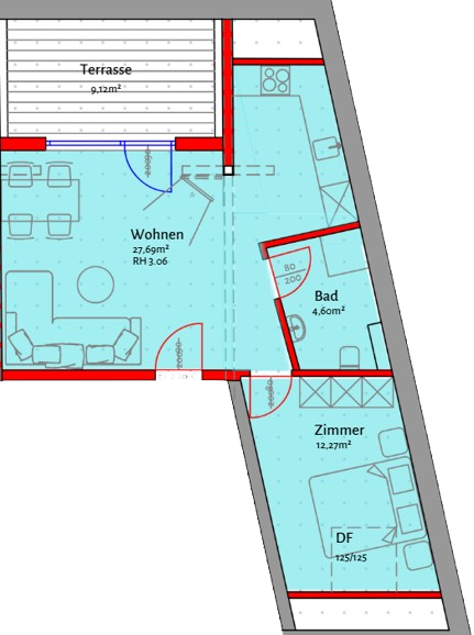 Raumaufteilung: Geräumiges Wohnzimmer mit integriertem Essbereich, separates Schlafzimmer, eine moderne Küche (unmöbliert, aber mit Anschlüssen für Geräte) und ein stilvolles Badezimmer mit Dusche, Waschbecken und WC. Zusätzlich ein praktischer Waschmaschinenanschluss im Bad.